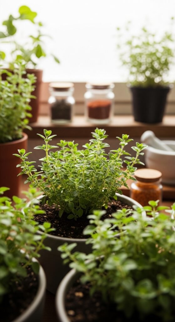 Marjoram, similar to oregano but milder, fits annual herbs lists for seasoning meats, soups, and vegetables. Its compact form suits containers nicely.