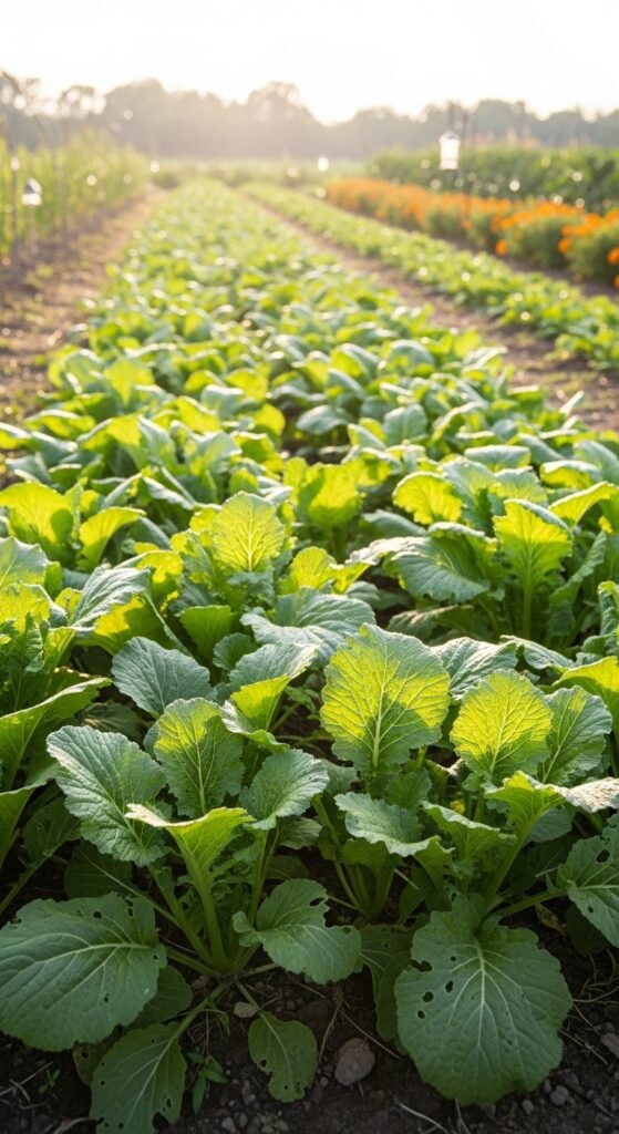 Benefits encompass fast growth and cold tolerance for extended seasons. It acts as a trap crop for pests.
