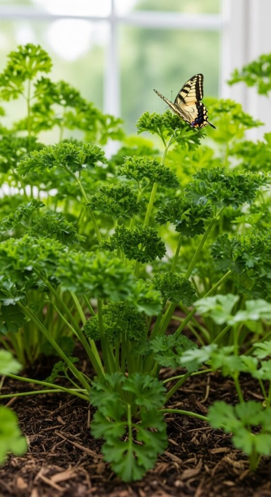 You gain practical benefits like masking bad breath and attracting swallowtail butterflies, whose caterpillars feed harmlessly on it. Parsley’s dense growth suppresses weeds, making it a low-effort addition to borders.