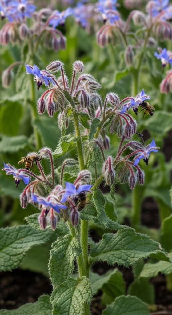 Borage, with star-shaped blue flowers and cucumber-flavored leaves, adds charm to annual herbs lists. Use in salads, drinks, or as garnishes for a refreshing twist.