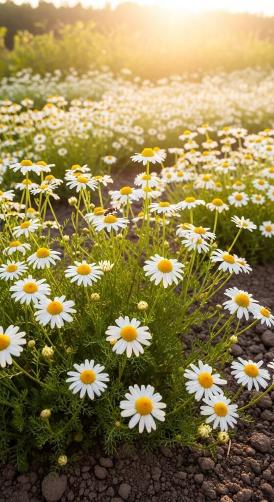 Chamomile graces annual herbs lists with daisy-like flowers used for soothing teas and skin remedies. German chamomile is the common annual type, easy to grow.