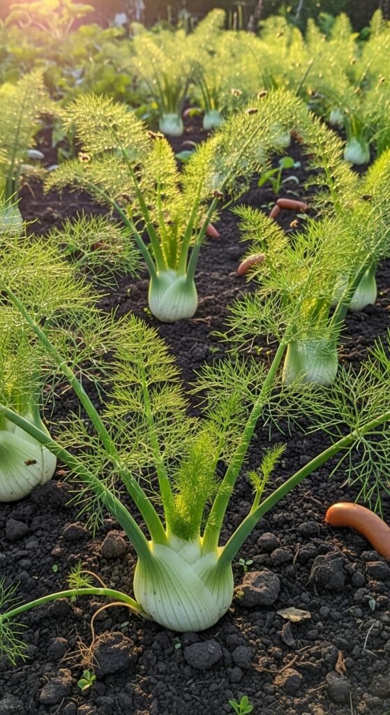 Fennel grows as an annual with feathery fronds and bulbs, flavoring sausages, salads, and liqueurs. It attracts beneficial insects and self-seeds readily.