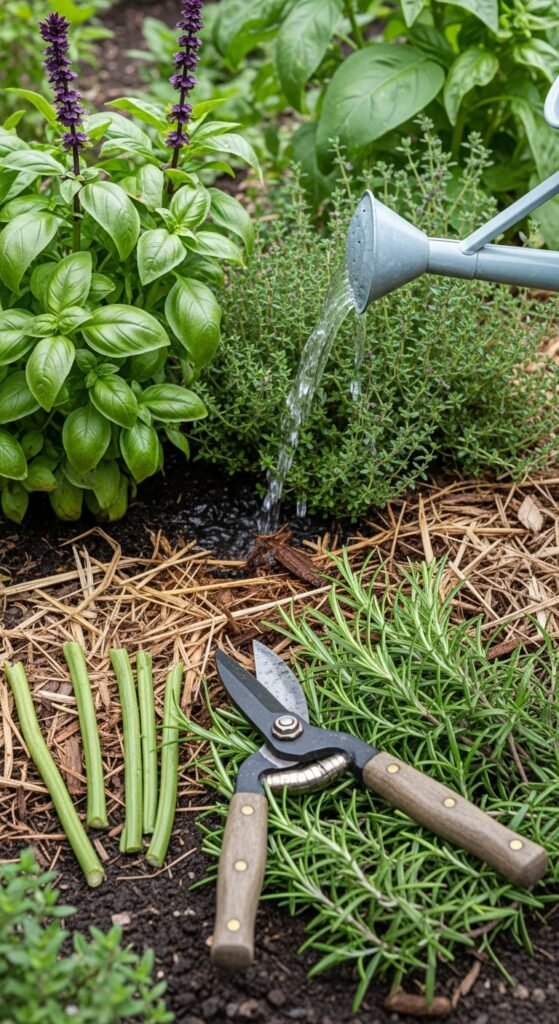Water deeply but infrequently to encourage strong roots. Mulch to retain moisture and suppress weeds. Harvest regularly to stimulate production, using clean shears to avoid disease spread.