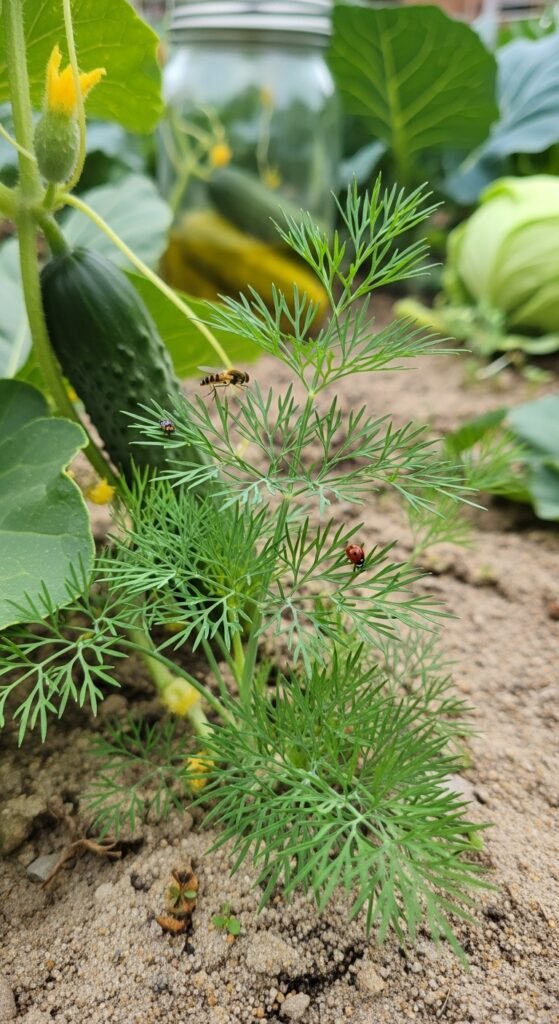 You’ll value its attraction to beneficial insects and digestive aid properties. Keep soil moist and harvest young leaves for peak flavor. It’s a great companion for brassicas, deterring pests naturally. Learn more about using it in preservation with our post on dill for pickling.
