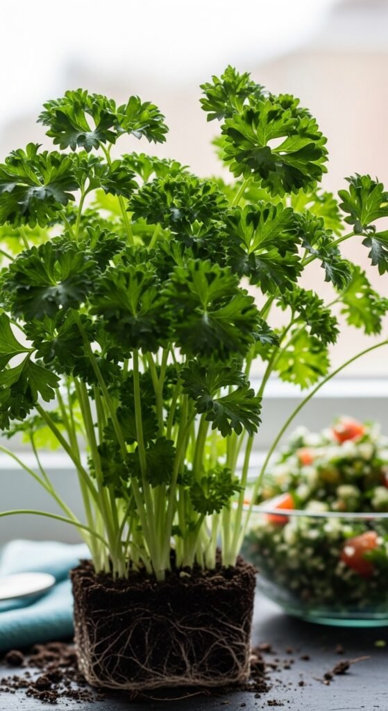 Parsley functions as a biennial but is often grown annually for its bright, curly or flat leaves in tabbouleh, soups, and as garnish. It tolerates light shade and enriches soil with nutrients.