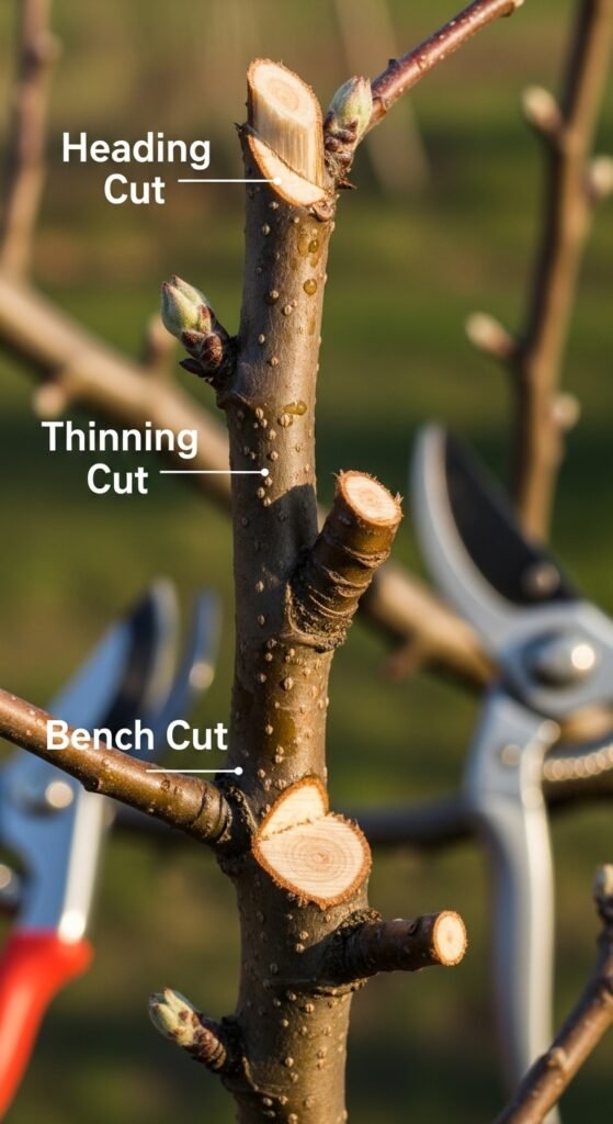 Use heading cuts to shorten branches, stimulating bushier growth below the cut. Apply to encourage fruiting spurs. Why selective? They invigorate lateral buds but can lead to dense canopies if overused, affecting light penetration.