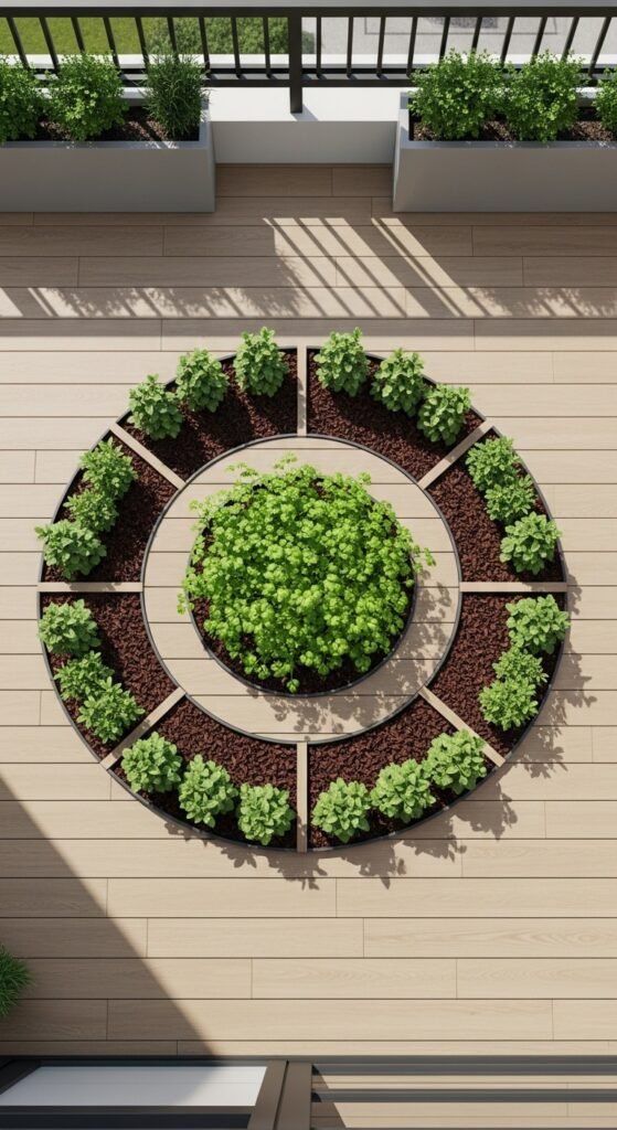 Arrange herbs in a circular wheel pattern using divided planters on your balcony floor. Segment for varieties like parsley in the center and trailing mint on edges.