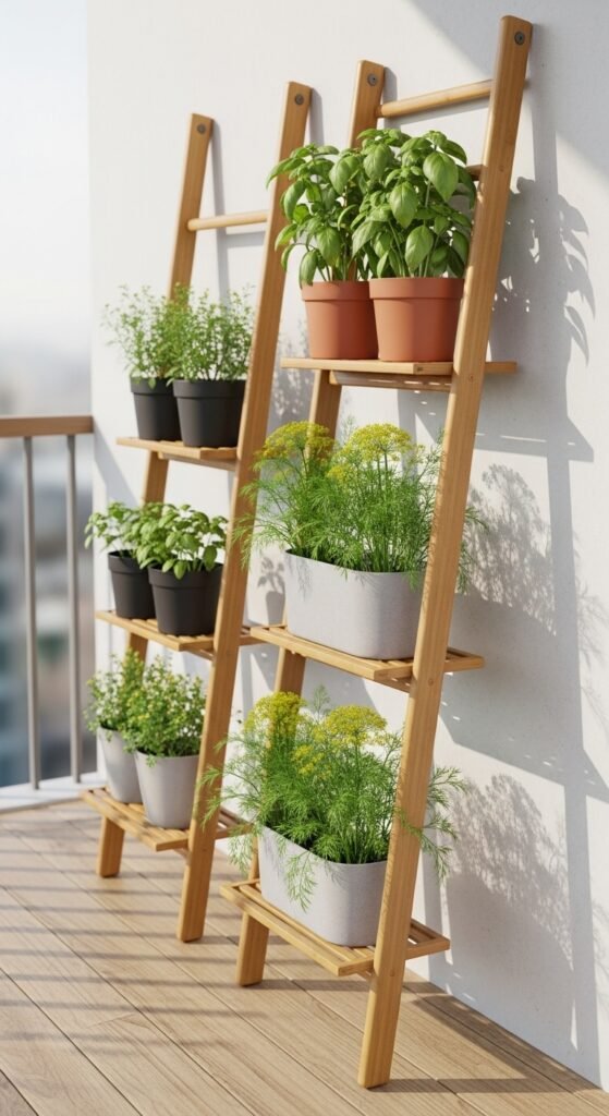 Repurpose ladders as tiered stands for potted herbs, leaning against balcony walls. Place shade-preferring herbs lower and sun-seekers higher, like dill below basil.