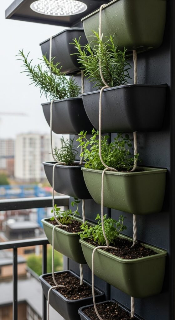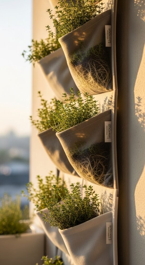 Hang fabric pockets on balcony walls for individual herb compartments. This flexible system accommodates small-rooted herbs like thyme, adapting to irregular surfaces.
