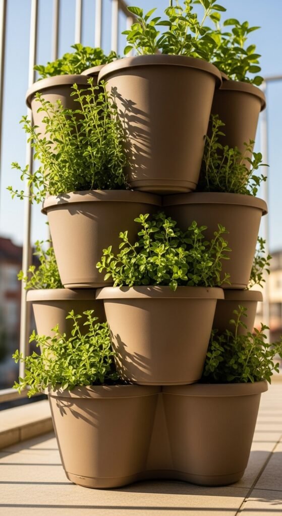 Stack terracotta or plastic pots in towers for a compact herb garden. Alternate sizes for stability, planting cascading herbs like oregano on outer rims.