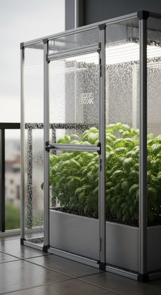 Enclose sections of your balcony with portable greenhouses for protected herb growth. This shields sensitive plants like basil from wind and temperature fluctuations.