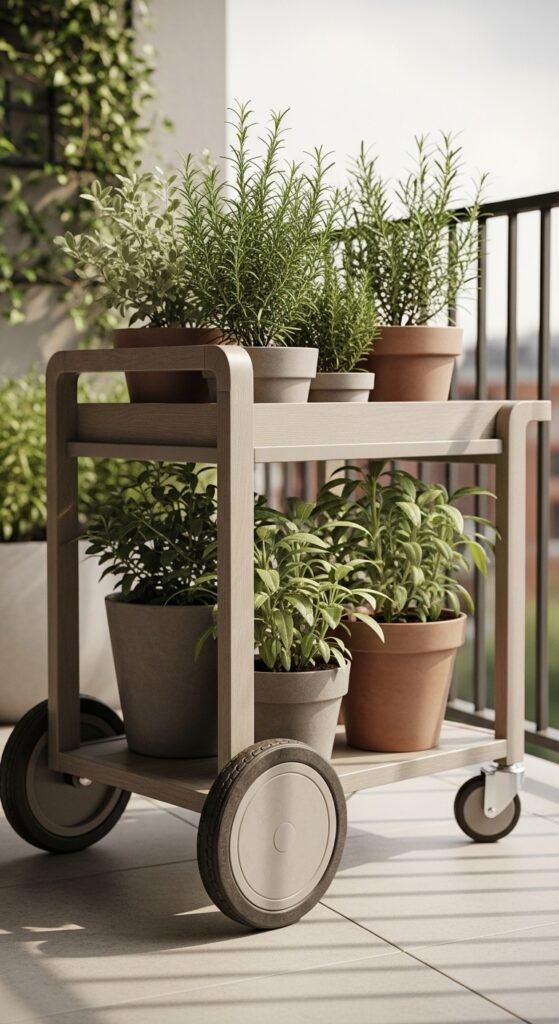 Use wheeled carts to house potted herbs, enabling mobility across your balcony. This allows repositioning for optimal sun, featuring mixed herbs like rosemary and sage.