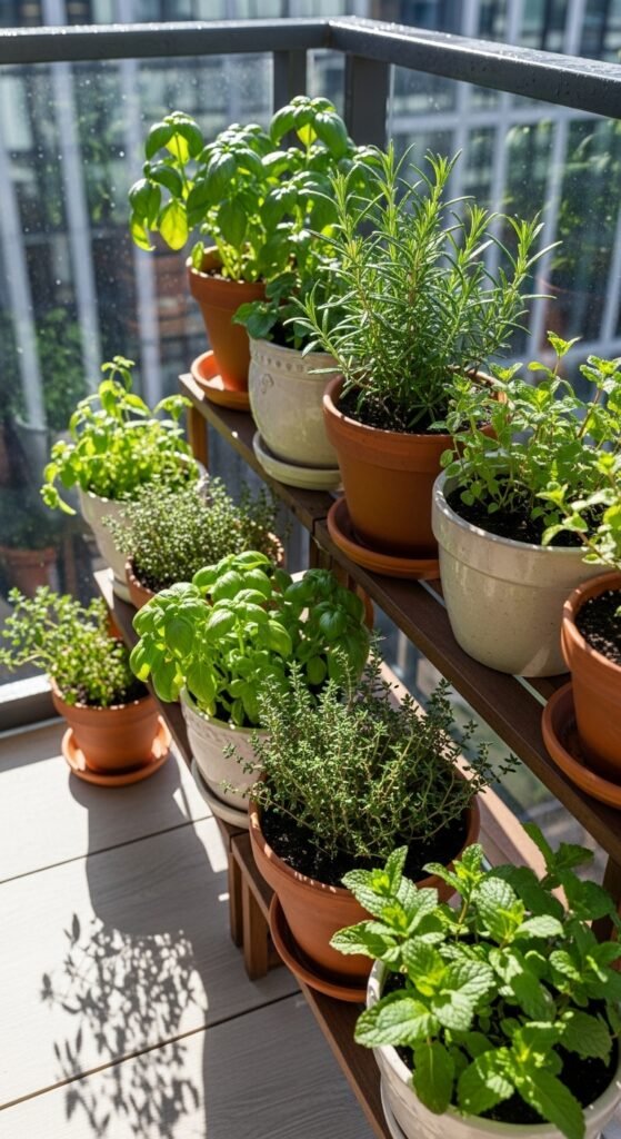 Employ multi-level shelves to organize herbs in a stepped formation on your balcony. This structure accommodates diverse light needs, with sun-loving basil on top tiers and shade-tolerant dill below.