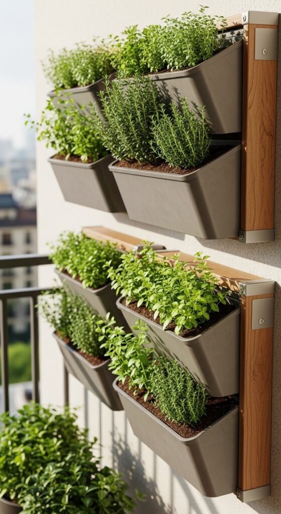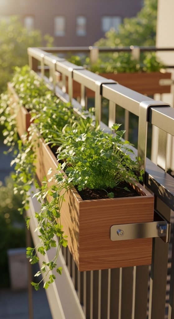 Attach herb boxes directly to your balcony railings to form a linear garden along the edges. These elongated containers accommodate trailing herbs like parsley or cilantro, creating a cascading effect that softens the balcony’s architecture.