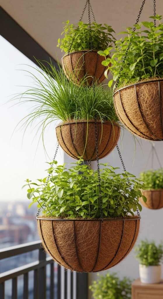 Suspend baskets from balcony ceilings or hooks to establish a floating herb garden. Ideal for compact herbs such as chives or mint, this arrangement adds dimension and allows light to filter through layers.