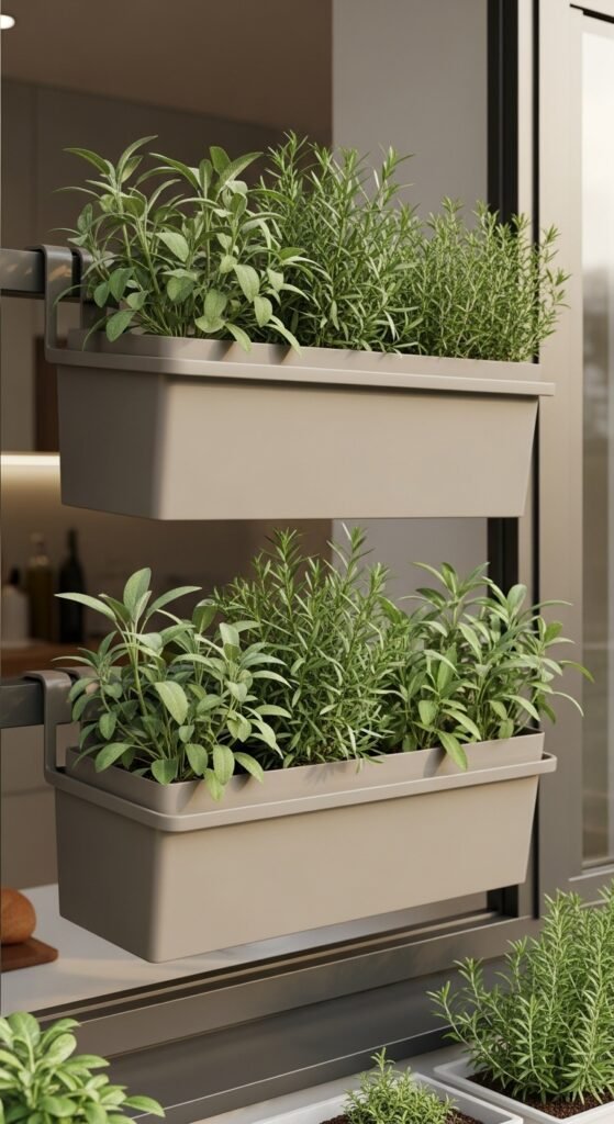 Mount window boxes outside your balcony-access windows to blend indoor and outdoor spaces. Plant compact herbs like sage or tarragon that complement your culinary preferences.