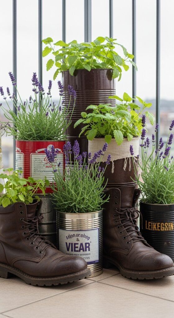 Transform everyday items like old tins or boots into unique herb containers. Group them on your balcony for an eclectic, sustainable garden featuring herbs such as lavender or lemon balm.