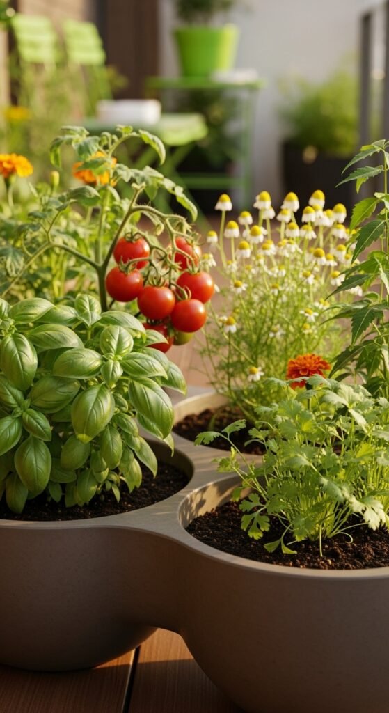 Pair compatible herbs in shared containers on your balcony, such as basil with tomatoes or chamomile with cilantro. This fosters mutual benefits in growth and pest control.