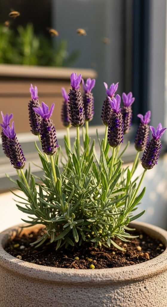 Key benefits include calming effects and pollinator attraction. Lavender excels in containers with alkaline, well-drained soil and ample sun.