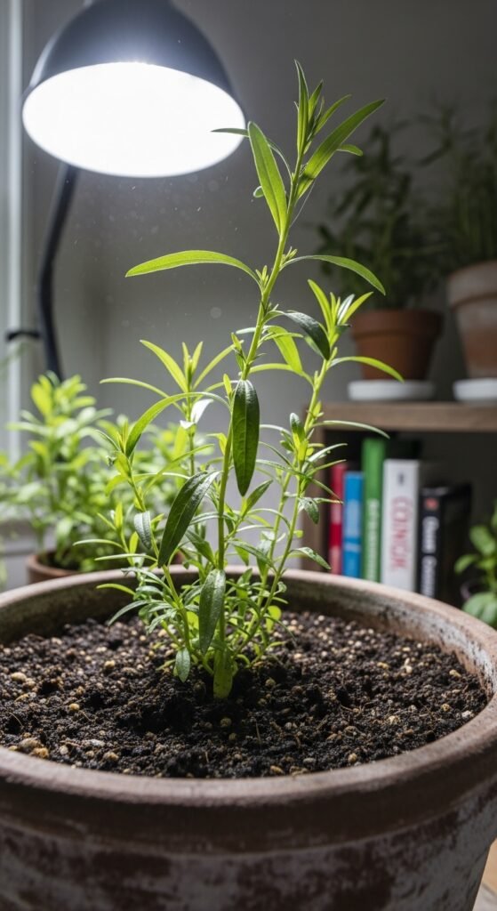 Tarragon, Artemisia dracunculus, is a perennial herb with anise-like leaves enhancing French cuisine. French tarragon is preferred for flavor. Its slender growth suits narrow containers.