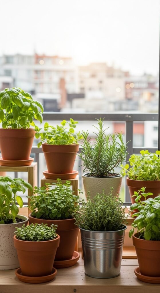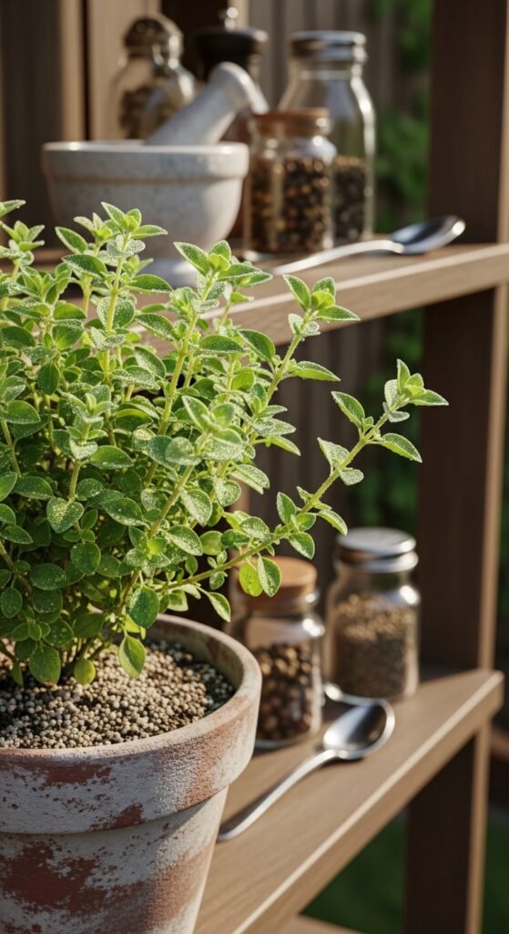 Thyme, scientifically Thymus vulgaris, is a low-growing perennial herb with small, aromatic leaves used in soups, stews, and marinades. Varieties like lemon thyme add citrus notes, expanding your flavor options. Its compact size makes it one of the best herbs for containers, fitting neatly on shelves or tabletops.