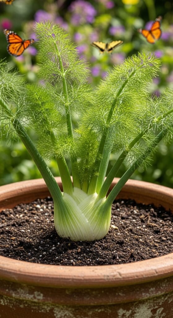 Key benefits include digestive support and butterfly attraction. Fennel grows best in deep containers with sunny, well-drained conditions.