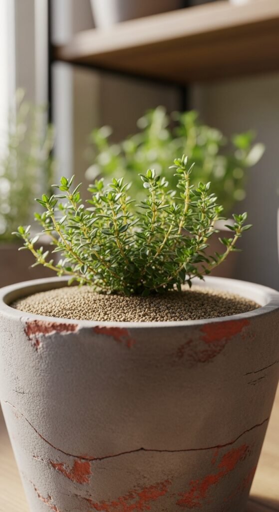 Sow thyme in a small pot with sandy soil mix. Position in a sunny location with 5-7 hours of light, watering only when dry. Harvest by snipping stems to encourage new growth. During colder months, draw from winter planter ideas to protect your thyme containers.