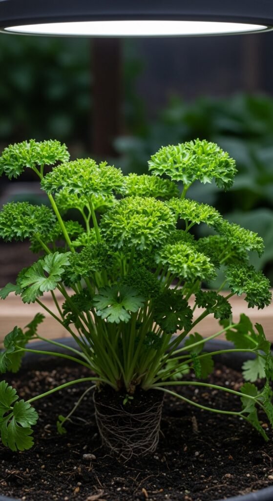 Parsley, Petroselinum crispum, is a biennial herb available in flat-leaf or curly varieties, essential for garnishes and flavoring. It provides a fresh, slightly bitter taste that brightens dishes. Its rosette growth pattern suits container cultivation, where you can harvest outer leaves continuously.