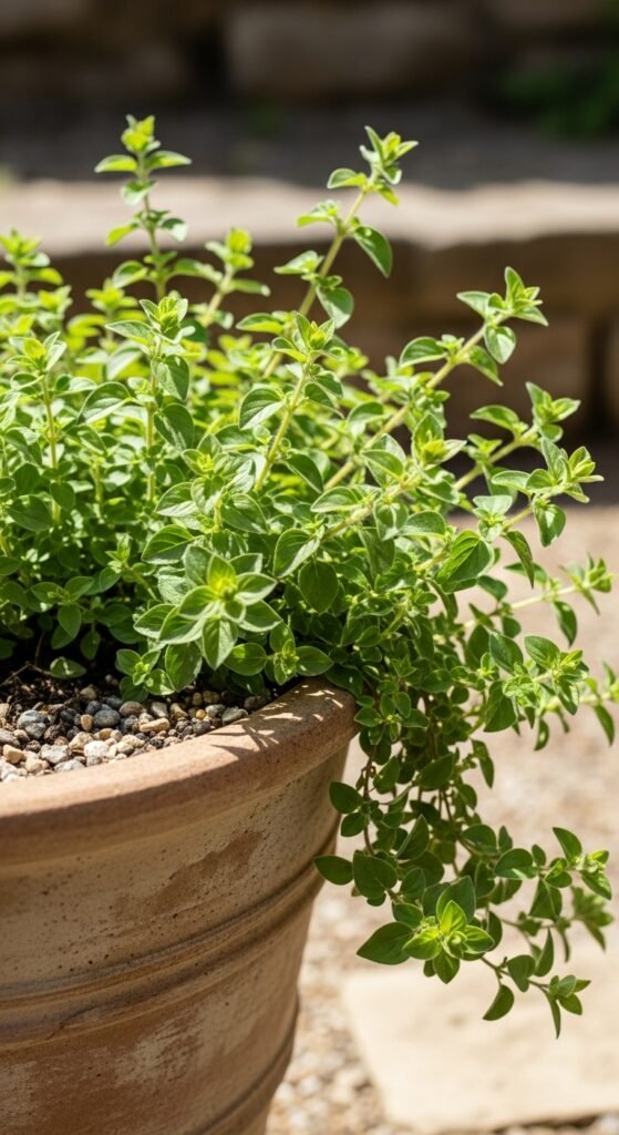 Plant oregano in a well-draining pot with gravelly soil. Ensure 6-8 hours of sunlight and trim regularly. For efficient watering, explore wicking bed techniques adapted for herb containers.