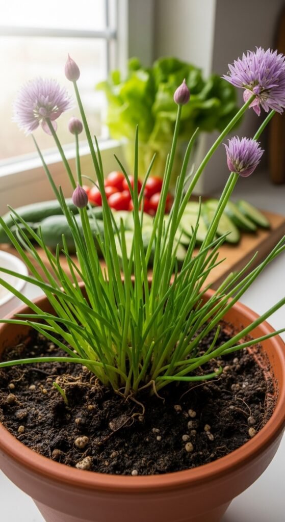 Key benefits encompass pest deterrence and nutritional value. Chives thrive in containers with moderate light, making them versatile for indoor gardening.