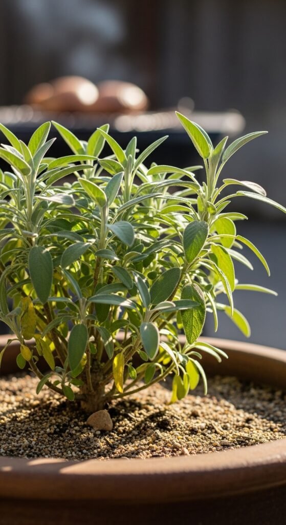 Plant sage in a spacious pot, allowing room for woody stems. Water sparingly and prune annually. For indoor overwintering, refer to winter houseplant care strategies applicable to herbs.