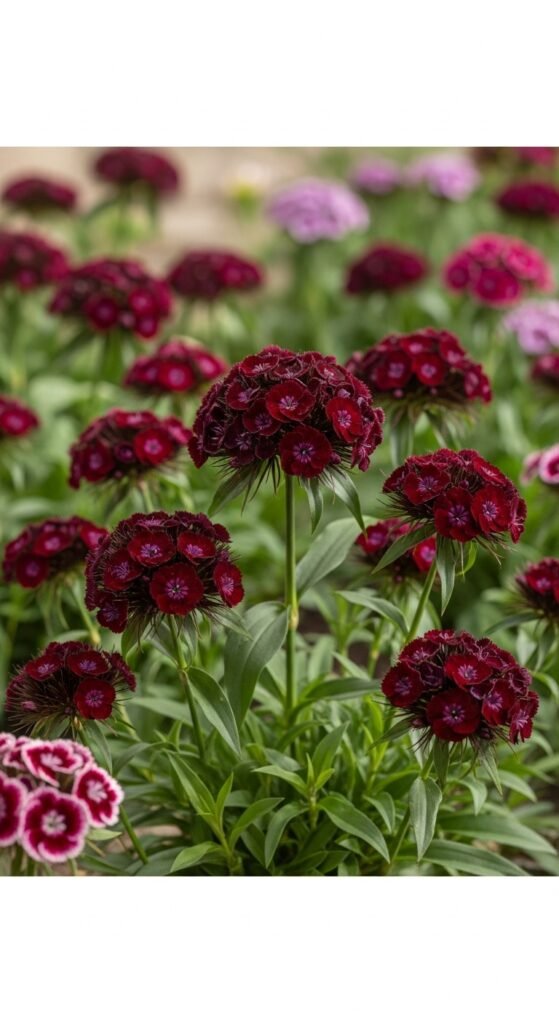 Discover the charm of black Sweet William (Dianthus barbatus ‘Sooty’), with clustered dark maroon flowers. This biennial grows 12-18 inches tall.