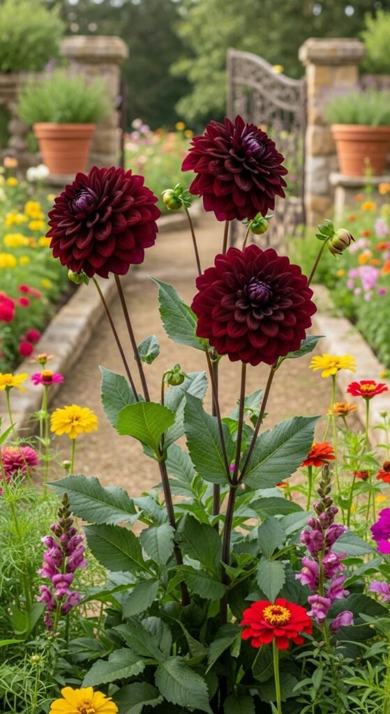 For a touch of vintage glamour, the Black Dahlia varieties like ‘Arabian Night’ offer dinner-plate-sized blooms in deep burgundy that mimic true black. These tuberous perennials grow 3-4 feet tall, flowering from midsummer to fall.