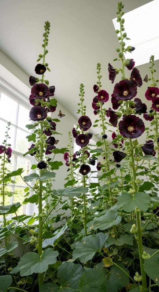 You’ll be enchanted by the towering spires of black hollyhock, such as ‘Nigra’, with near-black single flowers on stems up to 8 feet tall. This biennial or short-lived perennial blooms in summer, adding vertical drama.