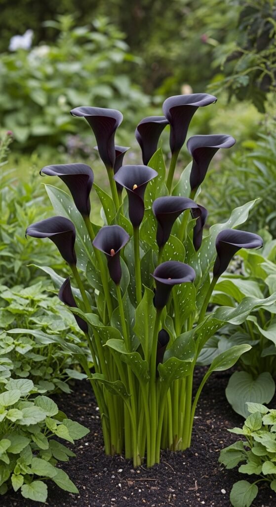 Elevate your garden with black calla lilies like ‘Black Star’, featuring dark spathes around yellow spadices. These bulbs grow 18-24 inches, blooming in summer.