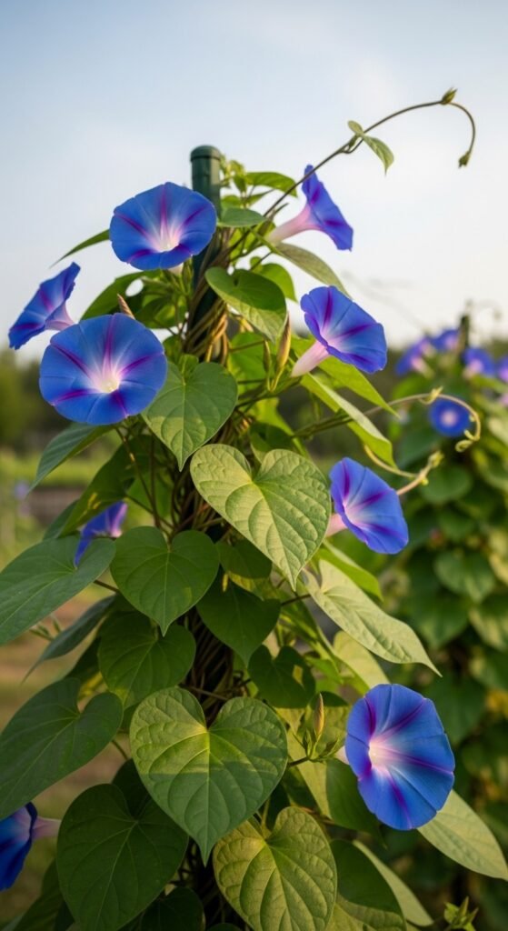 Morning glories are vigorous vines with heart-shaped leaves and trumpet-shaped blue flowers that open at dawn. These annuals love full sun and moderate soil, quickly covering trellises or fences.