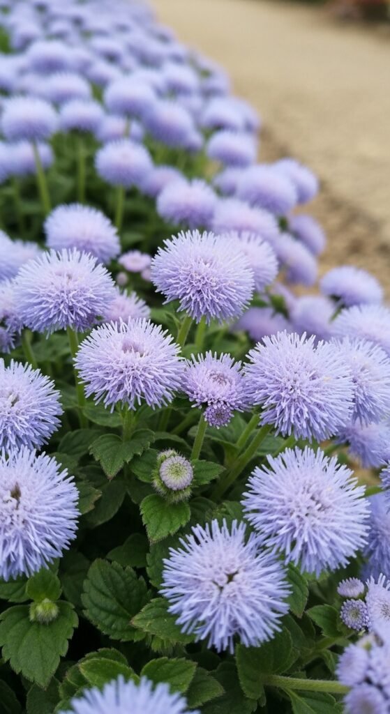 Ageratum features fluffy, powder-blue flower clusters that resemble pom-poms. This annual excels in full sun to partial shade and average soil, edging paths or filling containers.