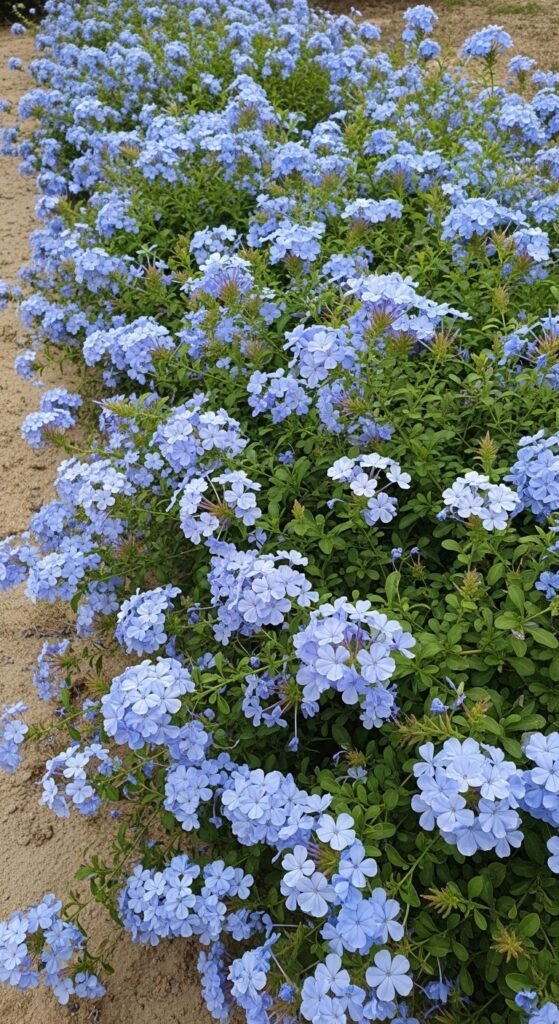 Plumbago bears clusters of sky-blue flowers on arching stems, suitable for groundcover or hedges. This perennial shrub loves full sun and sandy soil, tolerating heat and drought.