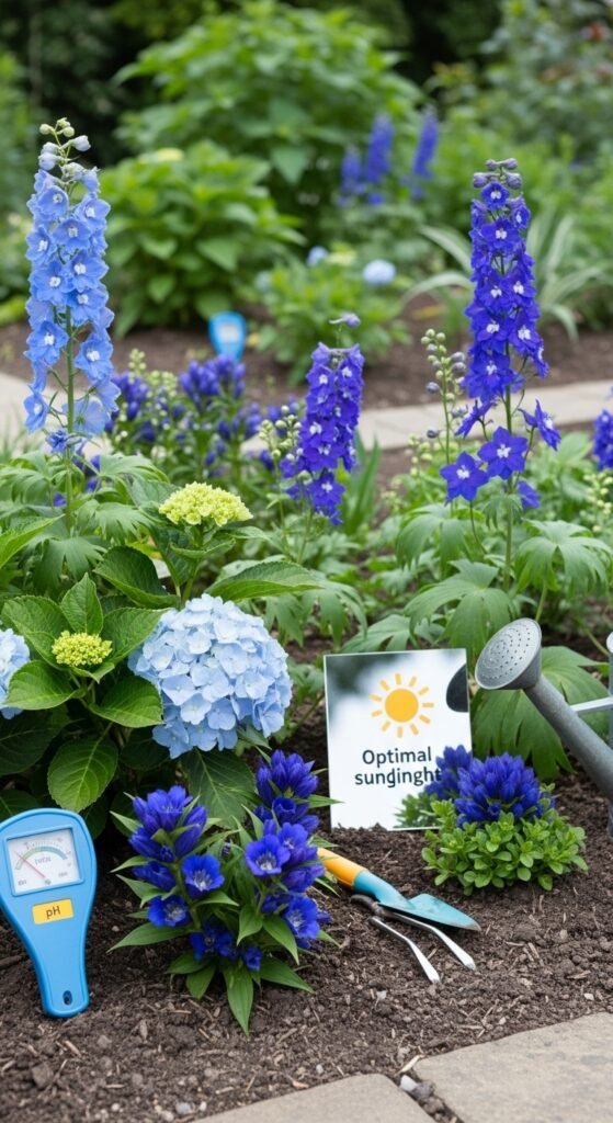 Many blue flowers, like hydrangeas, require acidic soil to maintain their color. Test your soil and amend with aluminum sulfate if needed. You can achieve vibrant hues by monitoring and adjusting pH levels annually.