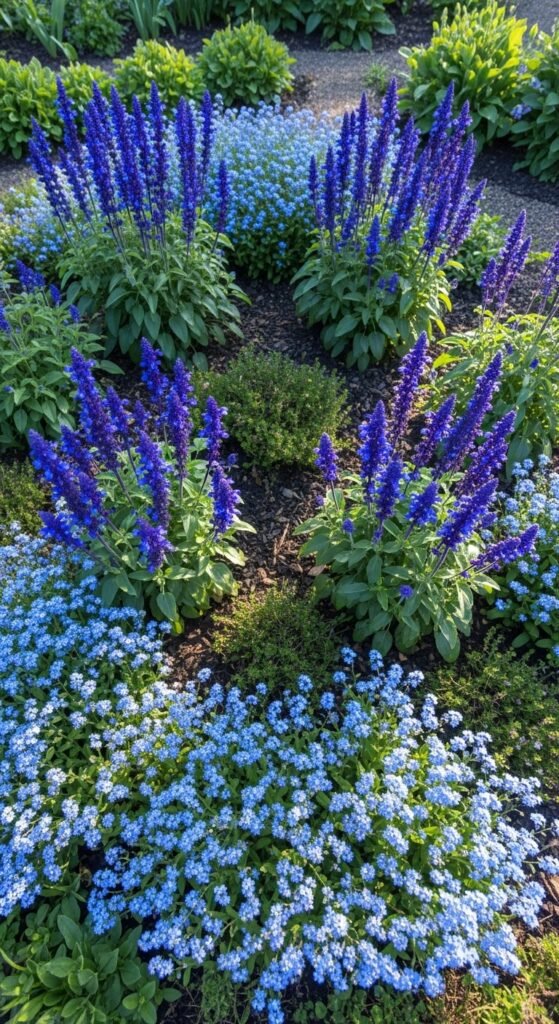 Position your blue blooms according to their needs—full sun for salvia, shade for forget-me-nots. Proper placement ensures healthy growth and maximizes flower production throughout the season.
