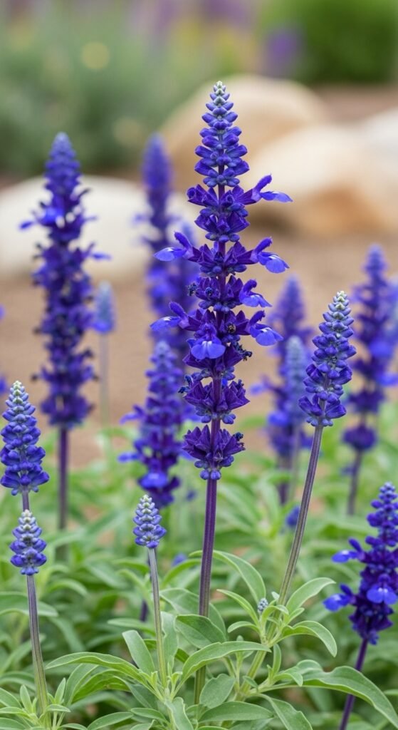Salvias, or sage plants, offer spikes of vibrant blue flowers that attract hummingbirds and butterflies. These drought-tolerant perennials thrive in full sun and well-drained soil, making them suitable for xeriscape gardens or hot, dry areas.