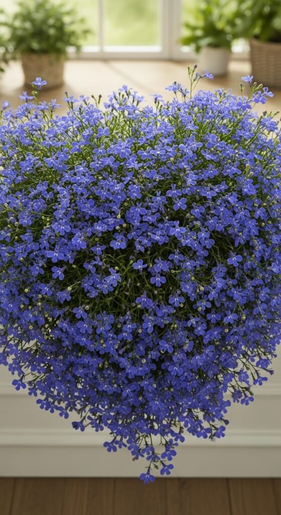 Lobelia produces masses of small, intense blue flowers that cascade beautifully from containers or edges. This annual loves partial shade and moist soil, ideal for hanging baskets or window boxes where it can trail elegantly.