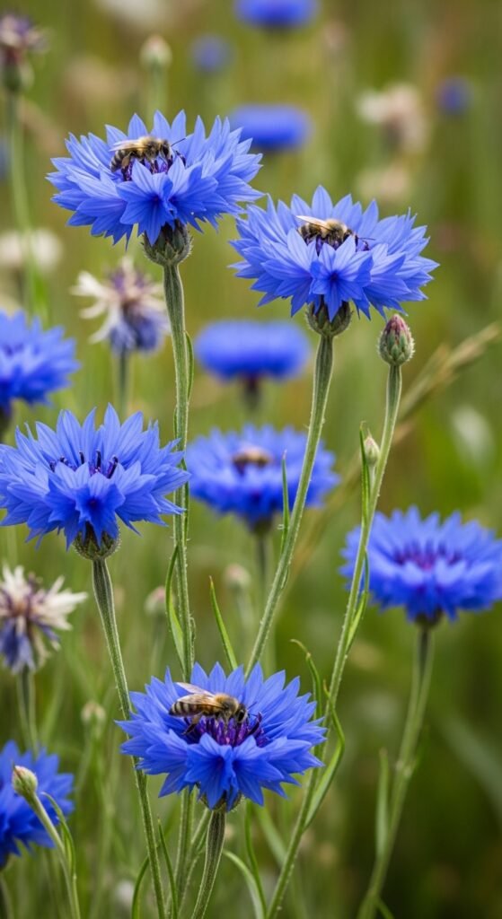 Cornflowers, also known as bachelor’s buttons, boast ruffled blue petals on wiry stems, evoking wildflower meadows. These annuals prefer full sun and average soil, self-seeding for future seasons with minimal effort.