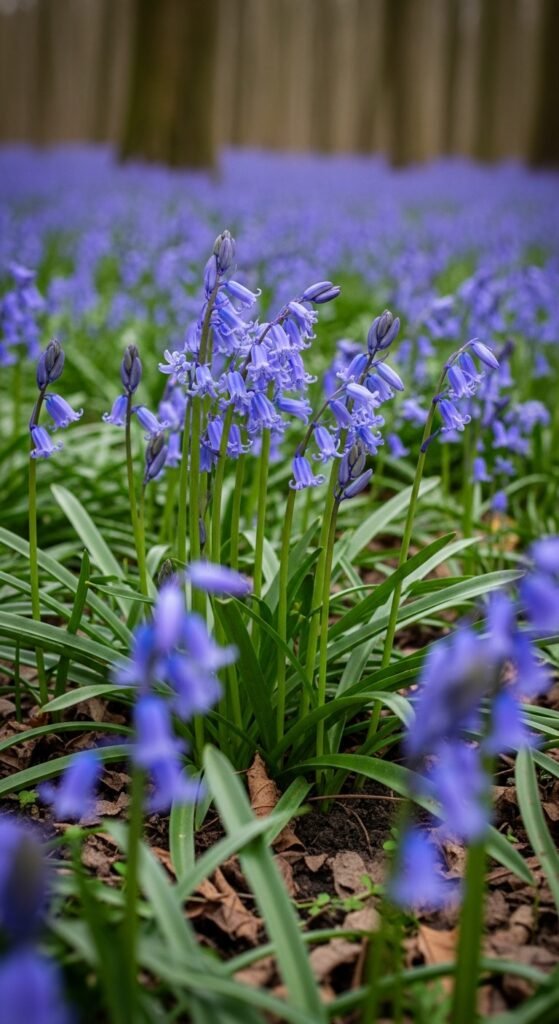 Plant spring-blooming bulbs like bluebells in fall, allowing them to establish roots before winter for robust displays.