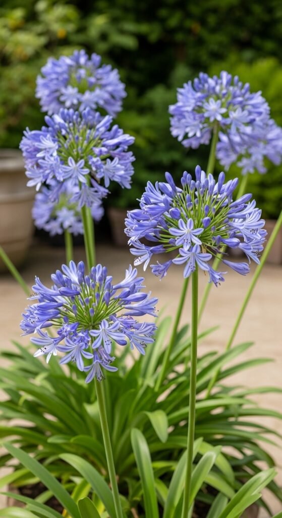 Agapanthus, or lily of the Nile, produces globe-shaped clusters of blue trumpet flowers atop sturdy stems. These perennials thrive in full sun and fertile soil, excellent for pots or borders in warmer climates.