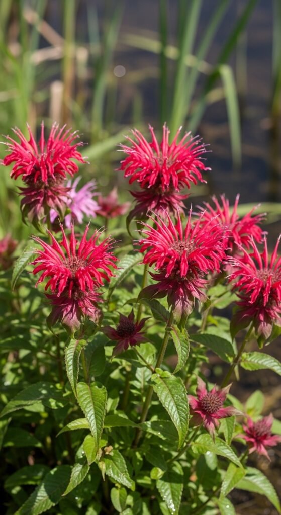 Monarda, or bee balm, features shaggy flowers in reds and pinks, aromatic foliage. Full sun, moist soil, zones 4-9.