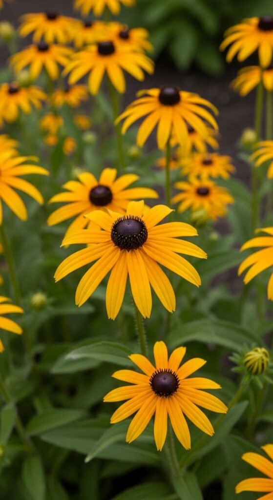 Rudbeckia offers golden petals around dark centers, blooming summer to fall. Full sun, average soil, zones 3-9.