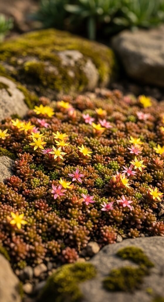 Sedum forms low-growing mats with star flowers in fall, drought-tolerant in full sun, zones 3-9.