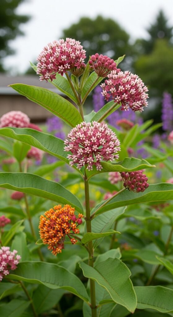 Plant milkweed to support monarch butterflies, as it’s their host plant for laying eggs. Varieties like common or swamp milkweed thrive in full sun to part shade with moist soil, growing as perennials in zones 3-9. The umbel-shaped flowers in pink or orange hues provide nectar for various pollinators.