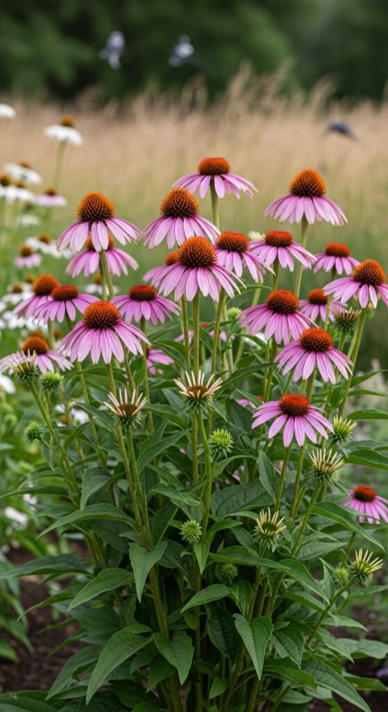 Echinacea, or coneflower, forms robust clumps with daisy-like petals in purple, pink, or white, centered by spiky cones. You plant them in full sun with well-drained soil, where they perennialize in zones 3-9, blooming midsummer to fall.